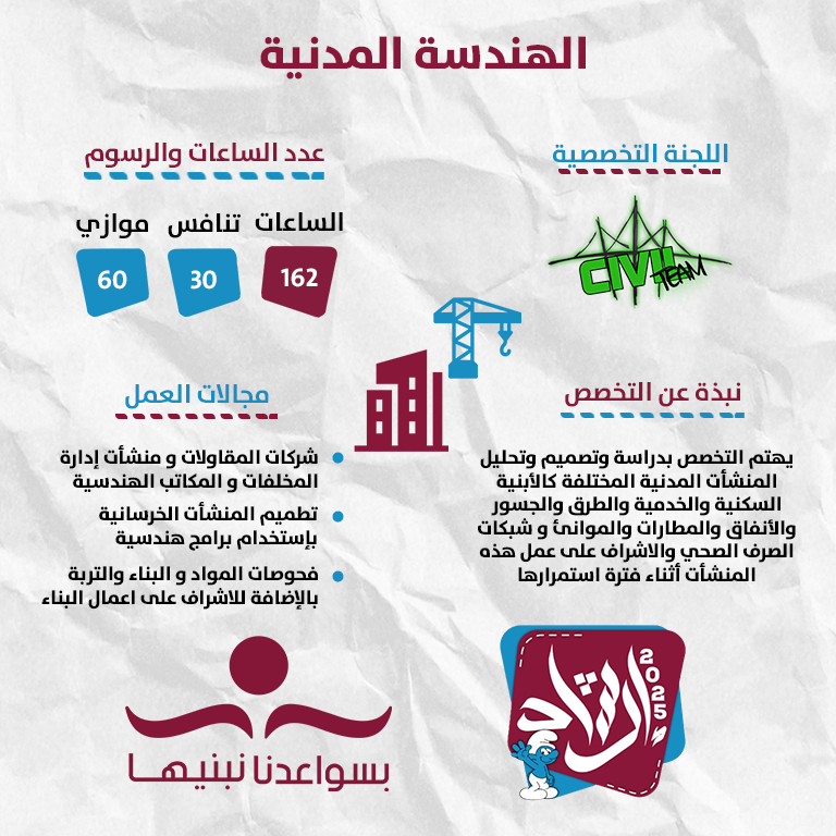 يهتم بالأعمال المساحية ودراسة خواص المواد المستخدمة في الإنشاءاتوالطرقات، وبتصميم الأبنية المدنية وتصميم الطرق ودراسة الحجمالمروري على الطرقات وتصميم الإشارات الضوئية والجسور والأنفاق