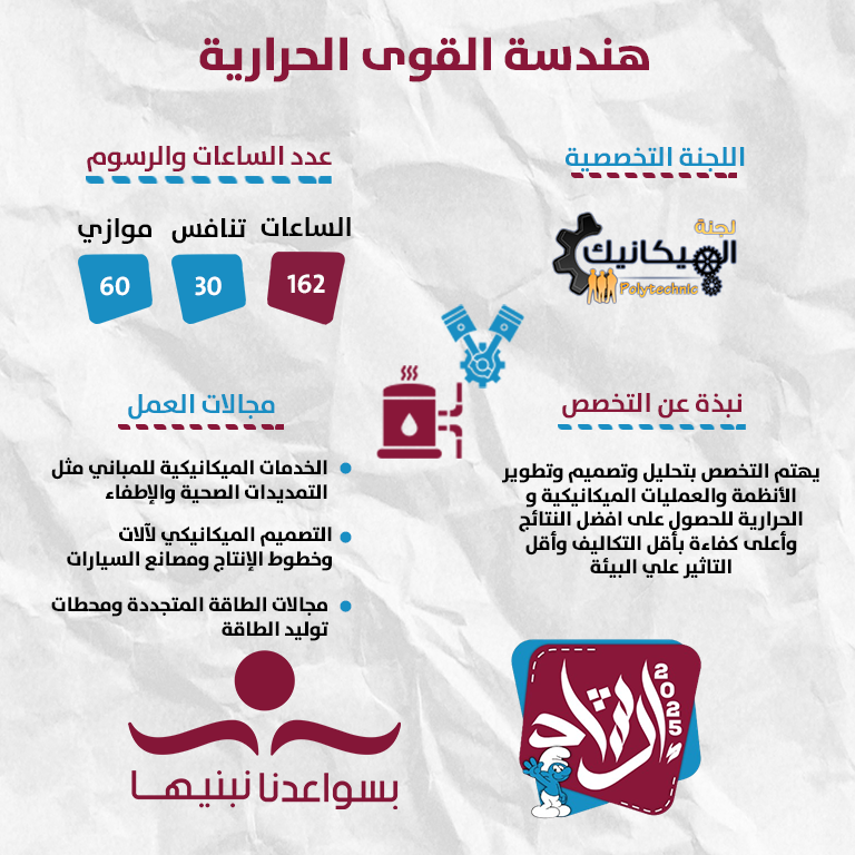 يهتم بتحليل وتصميم وتطوير الأنظمة والعمليات الميكانيكية والحرارية وآلات التشغيل ومولدات الطاقة التوربينة ومكابس آلات التشغيل والأجهزة الطبية المختلفة