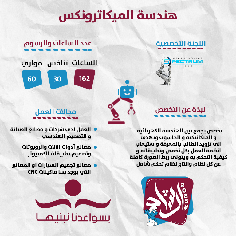 تخصص يجمع بين الهندسة الكهربائية والهندسة الميكانيكية – وهندسة الحاسوب، يهدف إلى تزويد الطالب بالمعرفة واستيعاب أنظمة العمل بكل تخصص وتطبيقاته وكيفية التحكم به، ويتولى ربط الصورة كاملة عن كل نظام وإنتاج نظام – تحكم شامل يستطيع حل مشاكل كهربائية وميكانيكية ومشاكل البرامج المتعددة